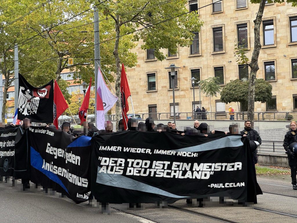 Am Freitag den 03.10.25 haben wir gegen die Einheitsfeierlichkeiten welche dieses Jahr in Saarbrücken stattgefunden haben eine lautstarke Demo durch die Saarbrücker Innenstadt mit organisiert. Die Demo zu der sich circa 80 Personen eingefunden haben begann pünktlich an der Europagalerie. Nachdem sich die Demo formiert hatte wurde das Gedicht „Todesfuge“ von Paul Celan abgespielt, denn die Zeile „Der Tod ist ein Meister aus Deutschland“ war Namensgeber unserer Demonstration.